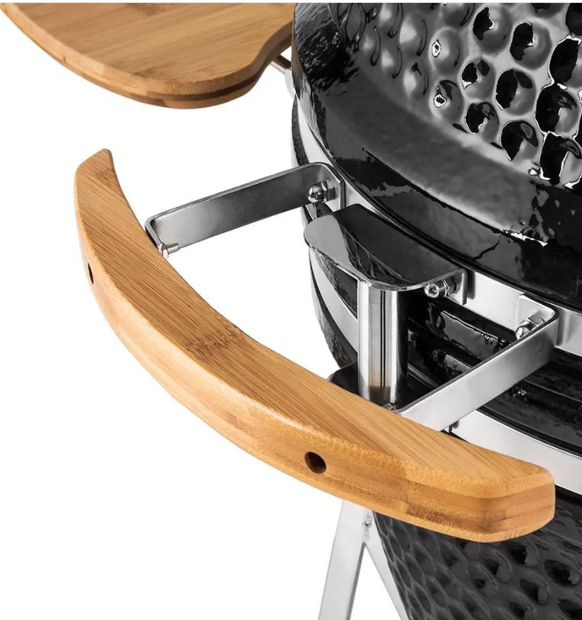 - Parrilla de acero inoxidable con sección abatible que facilita agregar combustible o astillas sin retirar los alimentos