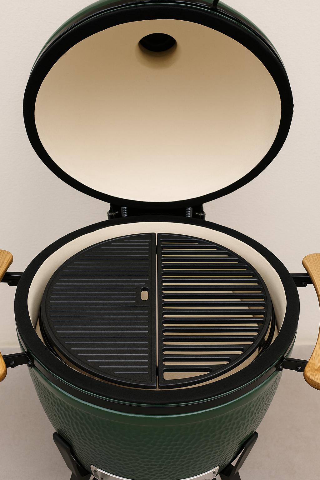 Este juego de rejillas de hierro fundido en forma de media luna está diseñado para maximizar la versatilidad de tu parrilla tipo Kamado, permitiéndote combinar distintas técnicas de cocción al mismo tiempo.